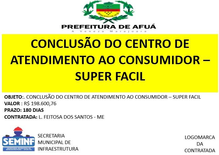 Após o Término dos Trâmites do processo de licitação, a empresa L.FEITOSA DOS SANTOS recebeu o aval da Prefeitura Municipal de Afuá para dar início aos trabalhos de Conclusão do Centro de Atendimento ao Consumidor Super Fácil.